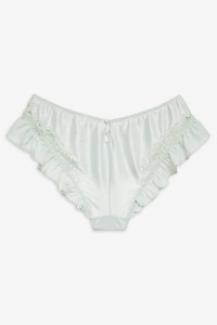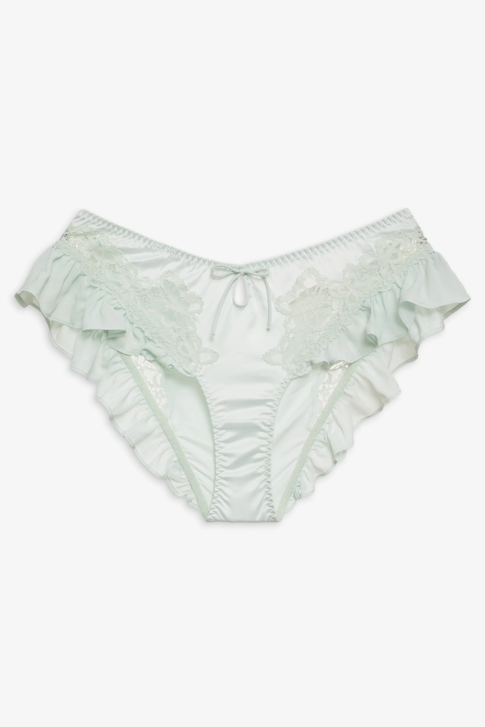 The Butterfly Lace Ruffle Cheeky mint green panty will breathe new life into your top drawer. Cut to a low-rise and with chiffon ruffle details—this cheeky panty is the perfect effortlessly feminine piece for summer. Style Notes - Low rise - High-cut leg - Rosette accents - Thong back coverage Fabric + Care - Lace is made of 58% recycled polyamide, 42% polyamide - Ruffles are made of 100% recycled polyester - Gusset is made of 100% modal - Hand wash cold - Do not wring or twist - Line dry - Do not iron - Do not dry clean