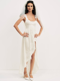 FOR LOVE & LEMONS KEEPSAKES: Designed with expert craftsmanship and a sense of modern romance, the Clemence cream maxi dress is an ode to old-world charm. Crafted with striking lace appliques, this exquisite cream gown features an empire waist, and a hi-low cut skirt with a thigh-high slit. It would make an unforgettable holiday party dress. Fit Notes - True to size Style Notes - Bust lining only - Semi sheer fabric - Adjustable back shoulder straps - Invisible zipper at center-back Fabric + Care - Crafted in 100% polyester - Dry clean only