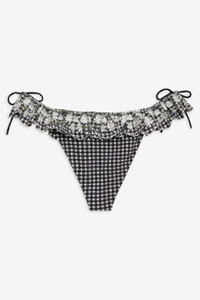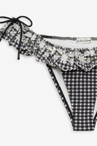 Become a retro Muse in the vintage-inspired Daisy Lane black bikini bottom. Crafted in a charming black and white gingham, this cheeky bikini bottom features dainty ruffled lace trim and bow details at hips. Pair it with the Daisy Lane Bikini Top for the full bikini set. Style Notes - Fully lined - Elasticized waist and legline - Fixed ties at hips Fabric + Care - Crafted in 80% nylon, 20% spandex - Embroidery is made of 100% polyester - Lining is made of 90% nylon, 10% spandex - Hand wash cold - Drip dry in shade - Do not tumble dry - Do not iron - Do not dry clean