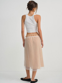 Inspired by vintage lingerie, the Devon Dot midi skirt charms with its nostalgic sheer white dotted mesh. This pull-on style polka dot midi skirt features a double layer skirt and is adorned with decorative elastic trim and a center-front bow. Pair it with the Devon Dot Bustier and Devon Dot Thong Panty for the complete lingerie set. Style Notes - Fully lined - Pull-on style - Double layer skirt Fabric + Care - Crafted in 100% polyester - Lining is made of 100% polyester - Hand wash cold - Do not wring or twist - Line dry - Do not iron - Do not dry clean