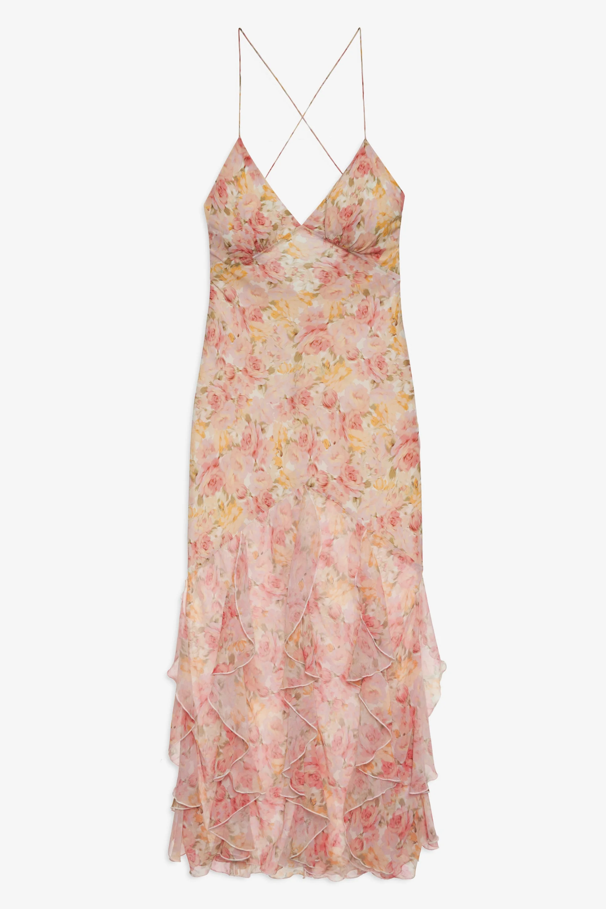 Embrace summer romance with the Elea floral maxi dress–an ultra-feminine floral printed ruffle maxi dress with a cascading ruffled skirt and a low open back with functional ties. Fit Notes - True to size - Fitted through body - Flairs at skirt Style Notes - Unlined - Invisible zipper at side seam - Adjustable shoulder straps that join at back and tie at center-back Fabric + Care - Crafted in 100% recycled polyester - Lining is made of 100% viscose - Contrast is made of 100% viscose - Eco dry clean recommended