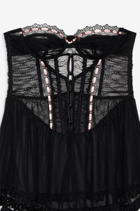 Designed for the Muse who loves to wear her lingerie out, the Elena Eyelet black slip dress is crafted in a sexy sheer eyelet embroidery and lightweight chiffon. This corset mini dress features underwire cups, a fully boned bodice, and full gathered skirt. Style Notes - Lined cups - Double layered chiffon skirt - Non-functional covered buttons down center-front - Center-back hook and eye closure and invisible zipper Fabric + Care - Crafted in 100% polyester - Cup is made of 100% polyester - Sides are made of 100% polyester - Embroidery is made of 100% polyester - Center back is made of 82% polyamide, 18% elastane - Lining is made of 60% polyester, 33% recycled polyester, 7% elastane - Hand wash cold - Only Non-Chlorine Bleach - Do Not ring or twist - Line dry - Do not iron - Do not dry clean