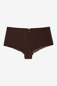 The Elliana sleep short was made for your slow stay-at-home days. These brown shorts spotlight a low-waisted fit, elasticized waistband, faux button placket at front, and are adorned with a rosette at waist and lettuce edge finishings. Pair with the Elliana Sleep Top for the complete pajama set. Style Notes - Cheeky back fit Fabric + Care - Crafted in 95% polyester, 5% elastane - Machine wash cold - Only non-chlorine bleach - Tumble dry low - Cool iron - Do not dry clean