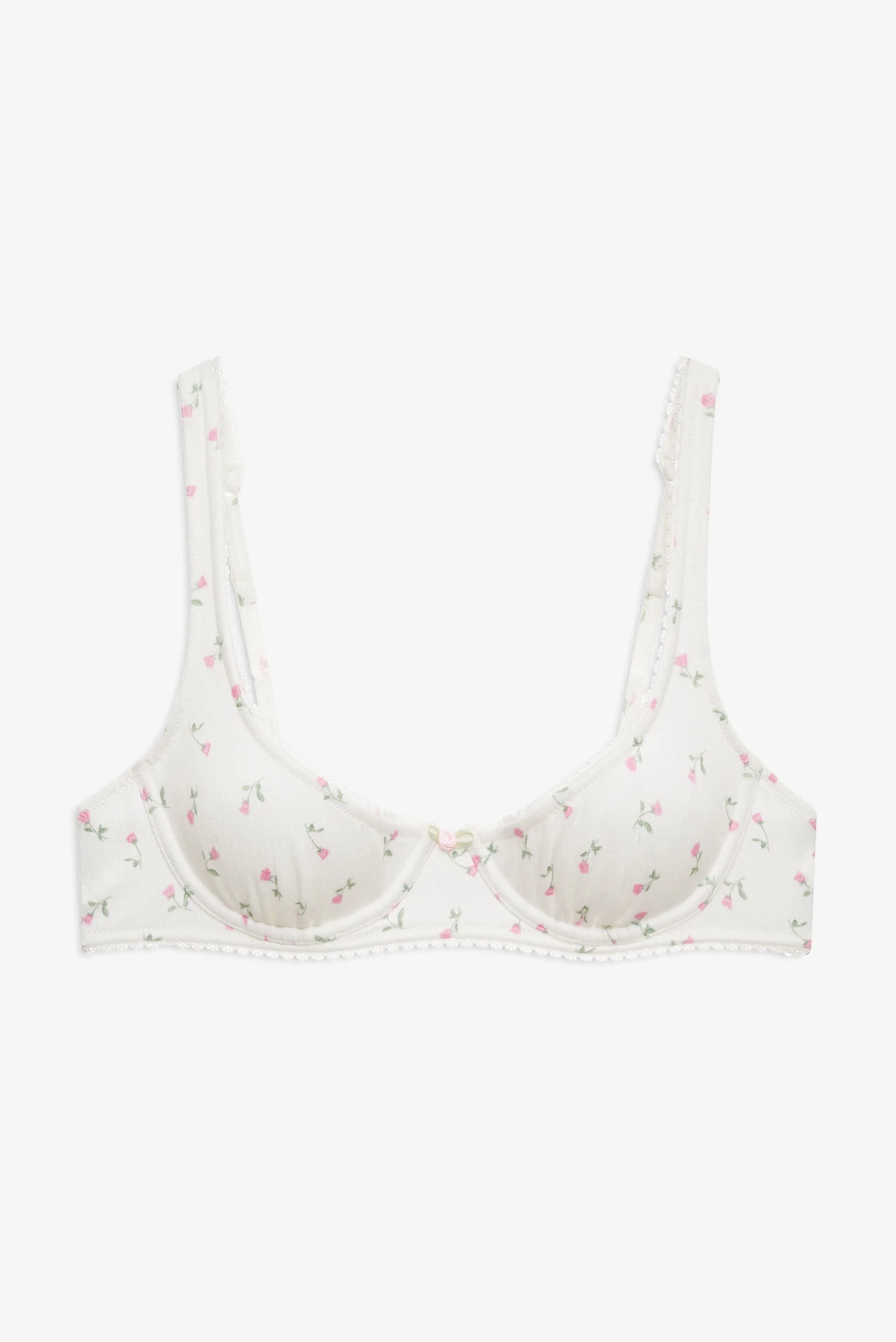 Build your dream top drawer with the Elliana unlined bra. Effortless, pretty, and personal, this white floral bra spotlight a contoured scooped cup shape with underwire and boning for a sleek fit, and is adorned with scalloped picot trims and a rosette at center front. Pair with the Elliana Thong Panty for the complete lingerie set. Style Notes - Adjustable shoulder straps - Bra clasp closure at center-back Fabric + Care - Crafted in 95% polyester, 5% elastane - Lining is made of 100% polyester - Hand wash cold - Only non-chlorine bleach - Do not wring or twist - Line dry - Do not iron - Do not dry clean