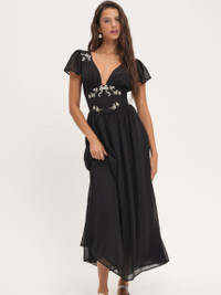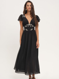 Inspired by the glamour of a bygone era, the Emmie black maxi dress was inspired by vintage silhouettes. Crafted in a sleek chiffon, this black gown spotlights a plunging neckline with ruched cups and skirt, flutter sleeves, and delicate floral and bow embroidery throughout. Style Notes - Fully lined - Functional self-covered buttons at the back waist Fabric + Care - Crafted in 100% polyester - Lining is made of 100% polyester - Dry clean only