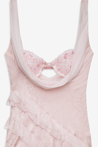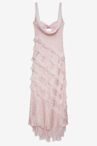 FOR LOVE & LEMONS KEEPSAKES: Crafted in 100% silk, the Florence pink ruffled dress exudes timeless femininity with its ultra-flattering bias-cut silhouette that slightly flares at the hem. This silk formal gown spotlights a contrast chiffon plunging cowl neckline and a removable sequin underwire bra for a look that captivates. Style Notes - Adjustable shoulder straps - Invisible zipper at side seam - Fully lined skirt in bias-cut chiffon Fabric + Care - Crafted in 100% silk - Contrast is made of 100% silk - Lining is made of 100% silk - Dry clean only