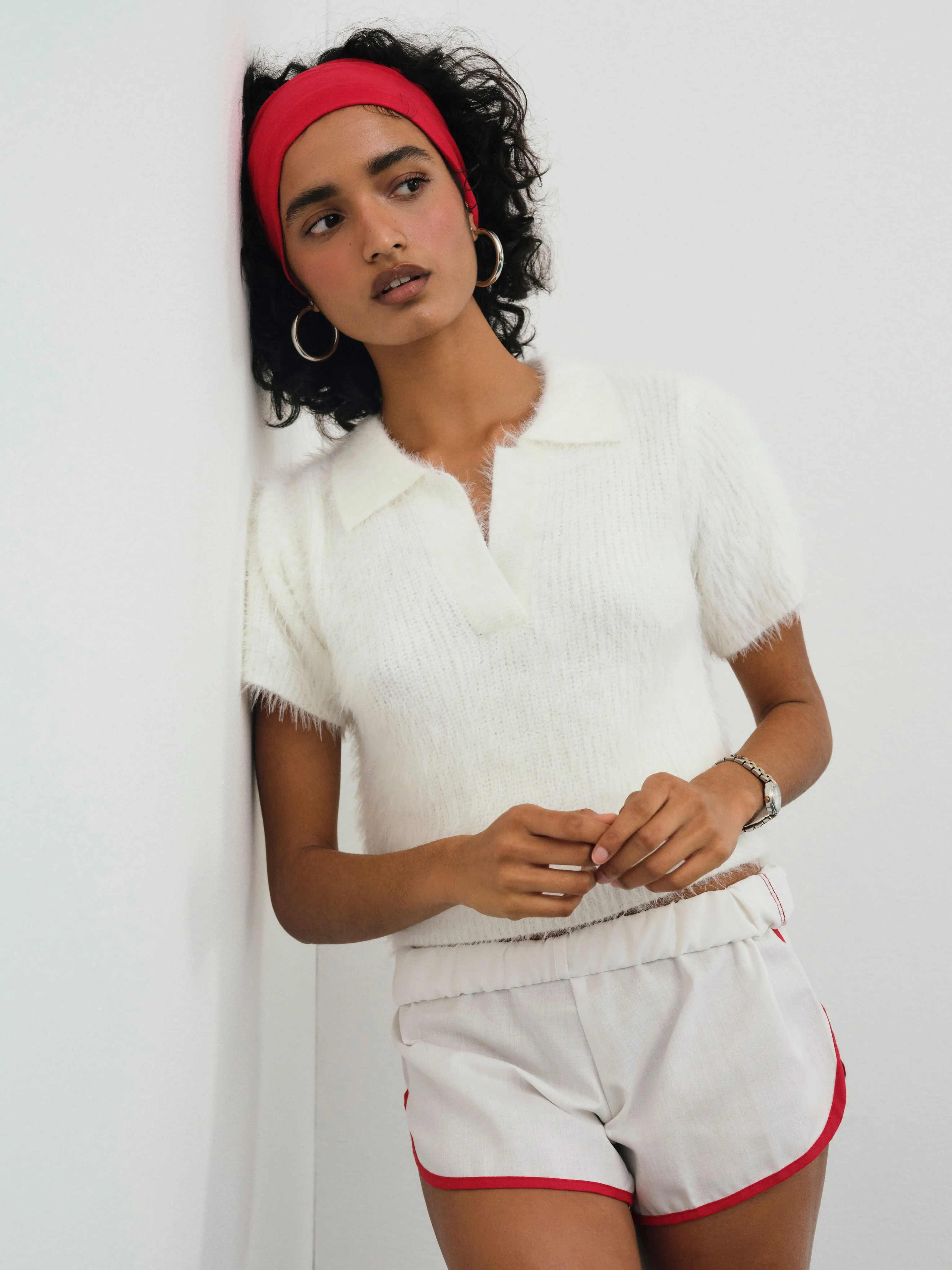 The Fuzzy knit top is designed for a sophisticated preppy look that transitions from court to cafe, and everywhere in between. Crafted in a fuzzy faux mohair knit, this ultra-chic boxy fit henley sweater spotlights a collared open neckline and falls to a cropped length. Style Notes - Unlined - Ribbed finishes along the hem and sleeve openings Fabric + Care - Crafted in 100% nylon - Dry clean only