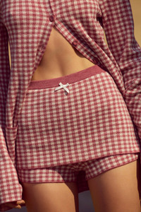 Effortless charm meets vintage inspiration with the Gingham skort—a red mauve mini skort crafted in a classic gingham knit. This high waisted skort includes a built-in interior short and features contrast ribbing and a fixed bow along the waistband for a polished look. Style Notes - Unlined - Elasticated waistband - Built-in interior knit shorts Fabric + Care - Crafted in 54% polyester, 20% nylon, 20% acrylic, 6% wool - Dry clean only