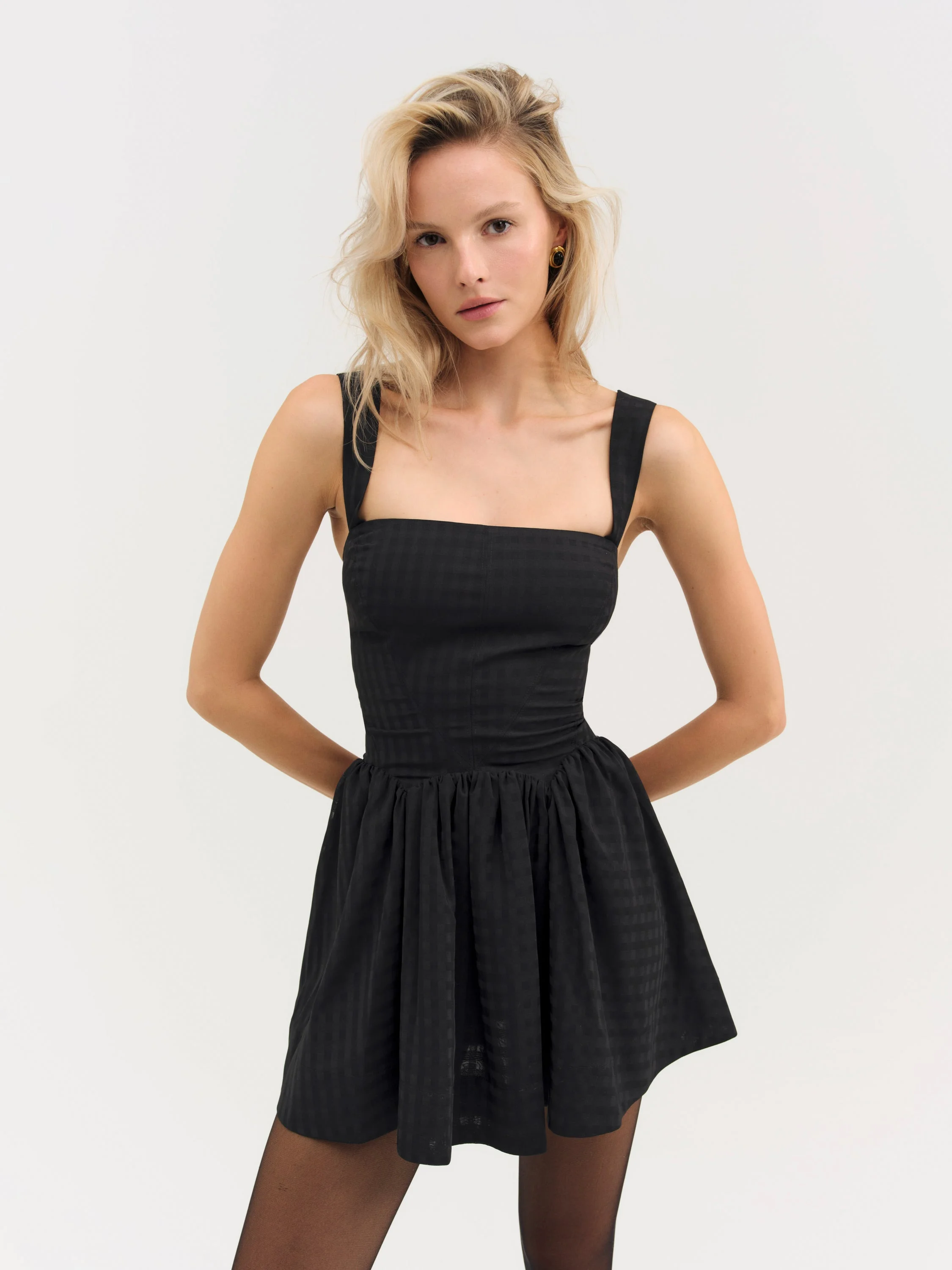 For late summer and the early days of fall, the Ginny gingham mini dress is the perfect staple for transitioning seasons. This black fit and flare mini dress features a full gathered skirt and scalloped details at the drop waist. Fit Notes - True to size Style Notes - Fully lined - Zipper at center-back Fabric + Care - Crafted in 100% polyester - Lining is made of 98% recycled polyester, 2% spandex - Dry clean only