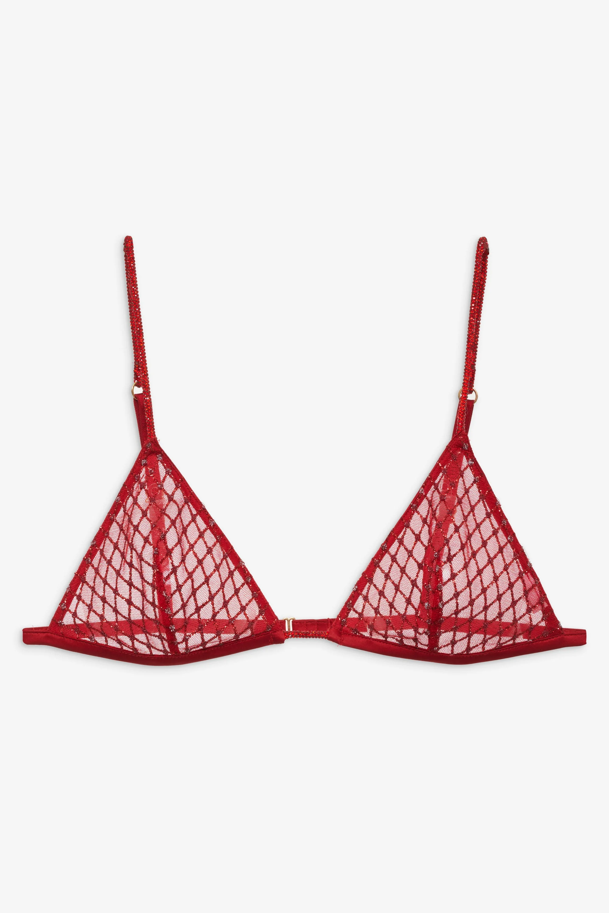 A Highly Coveted For Love & Lemons style, the Glitter red bralette brings glitz and glamor to your holiday outfits. Crafted in embroidered tulle mesh, this triangle bra spotlights a glittery grid print and embellished glitter straps. Pair it with the Glitter Thong Panty for a matching set. Style Notes - Lightly lined - Adjustable glitter straps - Back swan hook closure Fabric + Care - Crafted in 100% polyester - Hand wash cold, do not wring or twist - Line dry only