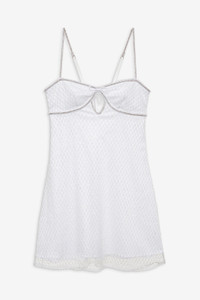 A Highly Coveted FL&L style, the bestselling Glitter white slip dress enchants and amplifies your honeymoon wardrobe. Coated in rhinestone embellishments, this embellished mini dress spotlights keyhole cutout accents. Style Notes - Fully lined - Functional back tie closure - Adjustable spaghetti straps Fabric + Care - Crafted in 100% polyester - Hand wash cold, do not wring or twist - Line Dry Only