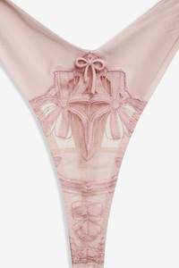 Inspired by all the bells and whistles of the French Rococo period, the Hallie pink thong spotlights double layered satin hip panels with tie-up bows at the side. This sexy thong is finished with an enamel bow charm at the center-front waist—pair it with the matching Hallie Underwire Bra for a complete lingerie set. Style Notes - Hip panels ruched at the center-back Fabric + Care - Crafted in 95% polyester, 5% elastane - Lace is made of 100% polyamide - Embroidery is made of 100% polyester - Gusset is made of 100% modal - Hand wash cold, Line dry