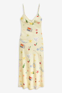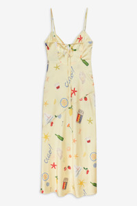 Get transported to the Italian Riviera with the Huda butter yellow maxi dress. A maxi slip dress with a low open back and functional ties crafted in a charming Positano print by artist Keely Murphy that captures the essence of summer living. Fit Notes - True to size Style Notes - Fully lined Fabric + Care - Crafted in 97% recycled polyester, 3% spandex - Lining is made of 97% recycled polyester, 3% spandex - Dry clean only