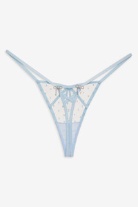 Frosty vibes. Style Notes - Mini dot mesh fabric - Satin elastic hip straps - Center-front keyhole with bow - Thong coverage Fabric + Care - Crafted in 100% polyester - Hand wash separately - Air dry with care
