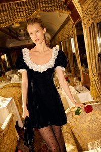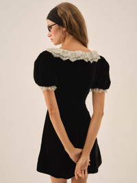 Crafted in rich velvet, La Vie en Bow black mini dress is an ultra-elegant option for your upcoming holiday parties. Featuring a scooped neckline and short puff sleeves with delicate lace trims—this velvet mini dress is finished with a single lace bow at the neckline for a chic and sophisticated look. Fit Notes - True to size Style Notes - Unlined - Invisible zipper at the center-back Fabric + Care - Crafted in 100% polyester - Lining is made of 98% recycled polyester, 2% spandex - Dry clean only