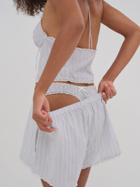 Designed to capture the ease of summer, the Lakeside striped blue flutter short exudes timeless appeal. These chic striped linen shorts spotlight pockets at the side seams, a crochet lace trim, and satin lingerie bows—pair them with the Lakeside Top for a co ord pajama set. Style Notes - Unlined - Elasticated waist Fabric + Care - Crafted in 80% cotton, 20% polyester - Dry clean only