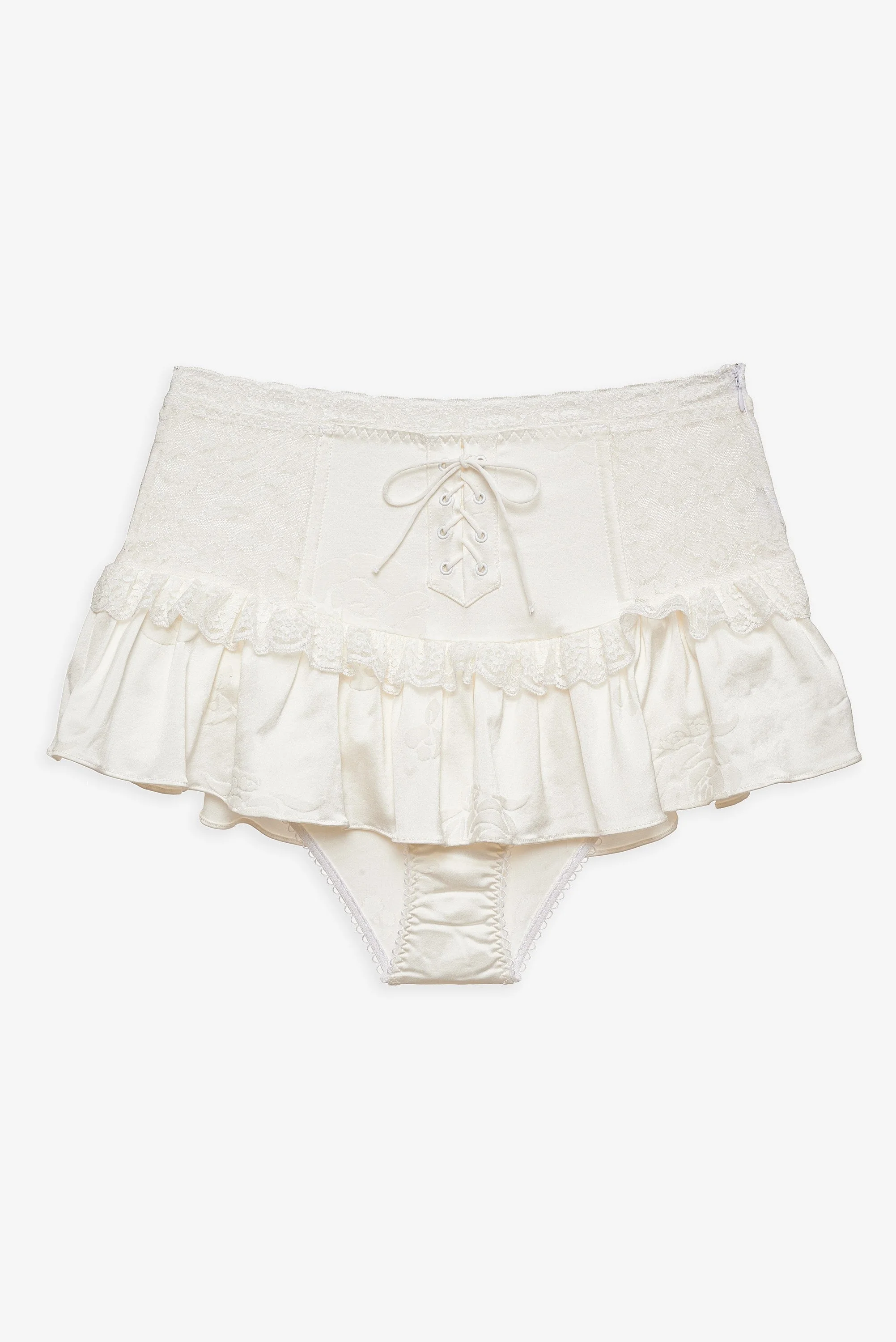 Designed for the dreamiest spring days and party-filled nights, the Lana corset skirt is crafted in an intricate floral jacquard and adorned with ruffled lace trim. This white micro skirt spotlights flattering contrast sheer lace side panels and a functional center-front lace-up placket. Style Notes - Built-in panty lining - Invisible zipper at side seam - Picot elastic along the interior panty leg openings Fabric + Care - Crafted in 98% viscose, 2% elastane - Lace is made of 82% polyamide, 18% elastane - Gusset is made of 100% modal - Hand wash cold - Line dry - Do not dry clean