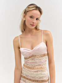 Made for late summer parties and crisp fall evenings, the Layer Cake lace midi dress is crafted in a pastel pink and brown heavyweight satin. This sheer midi dress spotlights a ruched satin sweetheart neckline and is cut to a bodycon fit. Fit Notes - True to size Style Notes - Bust lining only - Adjustable shoulder straps - Invisible zipper at left side seam Fabric + Care - Crafted in 100% polyester - Dry clean only