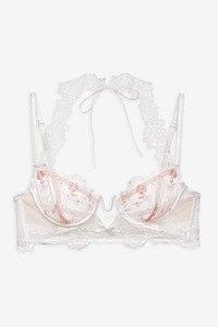 For a fresh take on nostalgic romance, the Le Fleur white lace bra exudes elegance with its floral embroidery and intricate lace trims. This halter bra features underwire cups, a U-wire detail at the gore, and a decorative satin bow with a charming pearl flower. Style Notes - Lined cups - Adjustable shoulder straps - Open cage back - Hook and eye closure at center-back Fabric + Care - Crafted in 82% polyamide, 18% elastane - Lace is made of 100% polyester - Hand wash cold - Only non-chlorine bleach - Do not wring or twist - Line dry - Do not iron - Do not dry clean