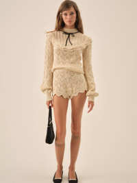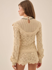 Crafted in a soft knit pointelle, the Lelia cream pointelle sweater features a mock neck collar, blouson sleeves, and is adorned with velvet ribbons and a bow at the neckline. The ruffle trim at the yoke completes the vintage-inspired look of this knit top. Pair it with the Style Notes - Unlined - Covered buttons and keyhole at the center-back Fabric + Care - Crafted in 100% cotton - Dry clean only