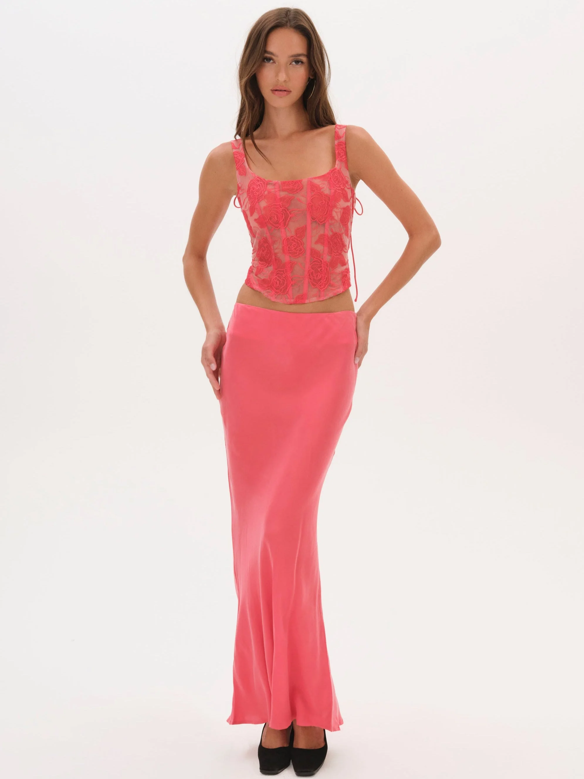 Chic and minimal, the Lena red maxi skirt exudes a sense of timelessness. Crafted in a silky cupro, this low rise skirt is cut on the bias, skimming the form and flaring out slightly at the hem. Fit NotesThe Lena Maxi Skirt is designed to sit low on the waist. It fits true to size. Style Notes - Unlined - Invisible zipper at the left side seam Fabric + Care - Crafted in 100% recycled polyester - Dry clean only