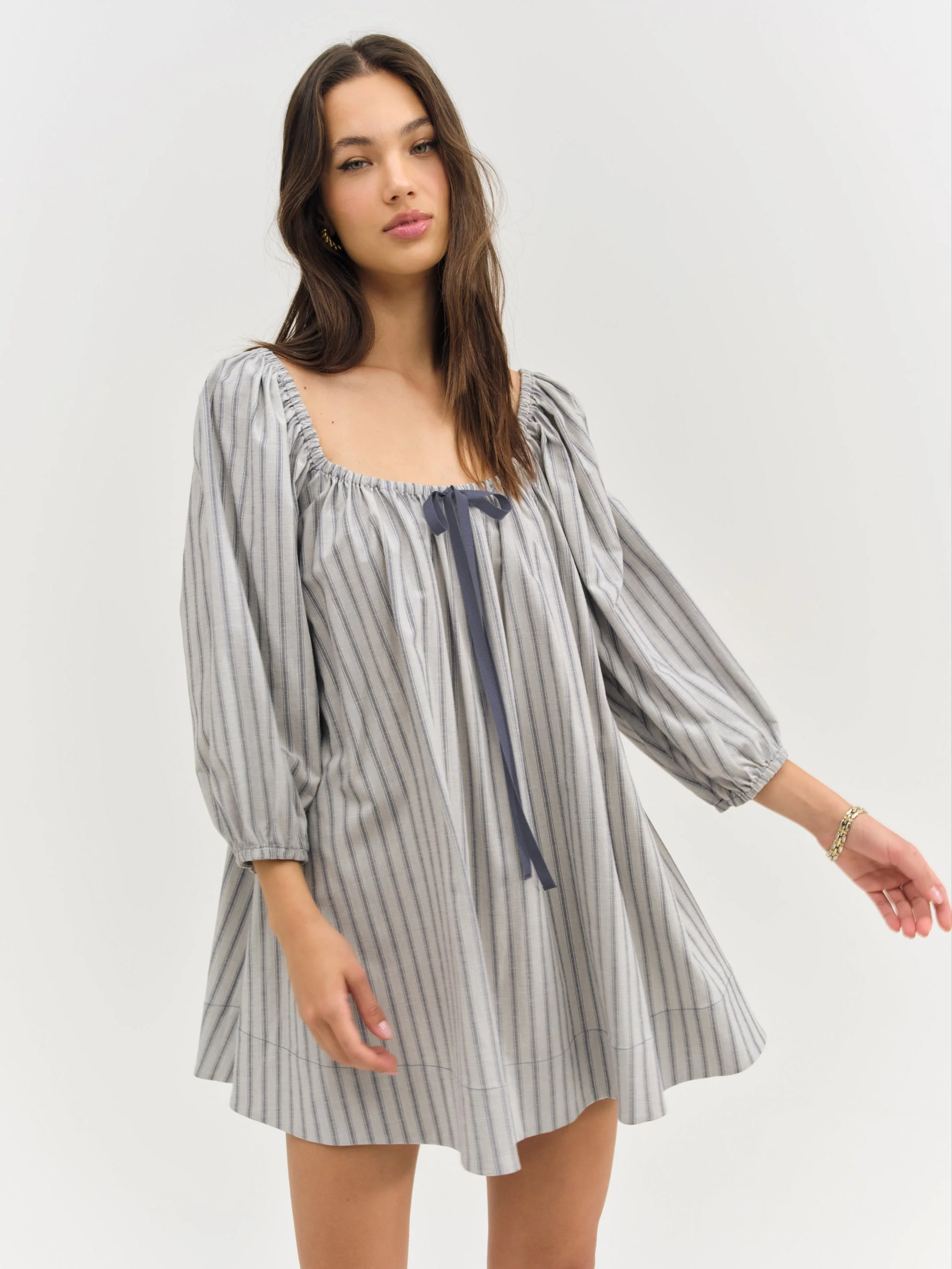 Anchor in your new pre-fall wardrobe with the Linen striped mini dress—a babydoll dress adorned with a center-front bow and featuring puff 3/4 length sleeves. Fit Notes - True to size - Loose fit Style Notes - Unlined - Elasticated shoulders, neckline, and sleeves - Full gathered body Fabric + Care - Crafted in 50% viscose, 33% polyester, 12% linen, 5% spandex - Dry clean only