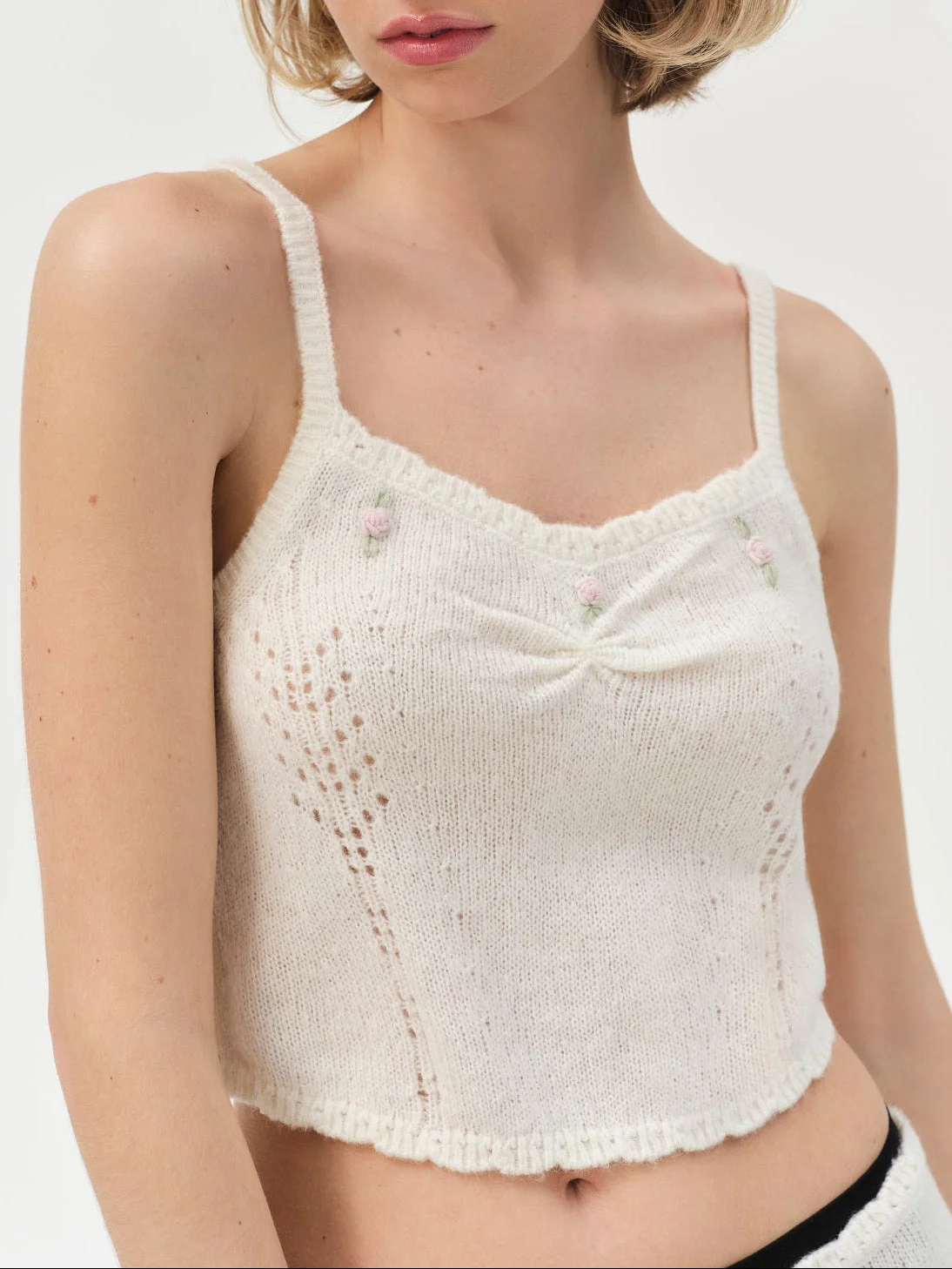 Meet the London Knit embroidered top, perfect for your lazy afternoon wardrobe. Crafted in a soft mohair pointelle, this sweater tank features rosette embroidery and scalloped hems. Pair it with the London Knit Panty for a co-ord look. Style Notes - Unlined - Ribbed shoulder straps Fabric + Care - Crafted in 58% acrylic, 33% nylon, 9% wool - Dry clean only