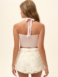 This knit halter top pairs a sweet baby pink hue with delicate floral accents, creating a springcrop top with soft, pastoral charm. Style Notes - High neck knit crop top - RIbbed halter straps that tie at center back - Satin appliques at chest - Unlined Fabric + Care - Crafted in 51% viscose, 28% polyester, 21% nylon - Dry clean only