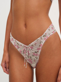 A slightly sheer floral thong with picot-trimmed edges, this sweet-meets-sensual style is the everyday piece your top drawer has been longing for. Complete the look with the Style Notes - Shirring at center front and center back - Decorative picot trim along edges - Fixed self skinny tie at center front Fabric + Care - Crafted in 88% polyester, 12% elastane - Gusset is made of 100% modal - Machine wash cold - Tumble dry low