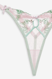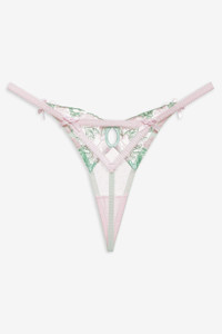 Introducing the Love Story pink panty, too charming to keep hidden away. Crafted in a romantic pink and green floral embroidery and dotted mesh, this g string features a decorative keyhole cut-out at center-front and is adorned with decorative elastic and satin bows throughout. Pair it with the Love Story Underwire Bra to complete the lingerie set. Style Notes - Unlined - G-string coverage Fabric + Care - Upper body is crafted in 100% polyester - Embroidery is made of 100% polyester - Lower body is made of 82% polyamide, 18% elastane - Gusset is made of 100% viscose - Hand wash cold - Only non-chlorine bleach - Do not wring or twist - Line dry - Do not iron - Do not dry clean