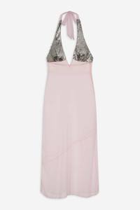 Take the spotlight this season in the mesmerizing Maia pink slip dress—a sheer maxi dress crafted in chiffon with a plunging V neckline, shimmering sequins at the cups, and a lace trim at the under-bust. Style Notes - Lined cups - Functional halter neck ties - Invisible zipper at the side seams Fabric + Care - Crafted in 100% polyester - Lace is made of 93% polyamide, 7% elastane - Yoke is made of 94% polyester, 6% elastane - Yoke lining is made of 78% polyester, 22% elastane - Hand wash cold, do not wring or twist - Line dry only