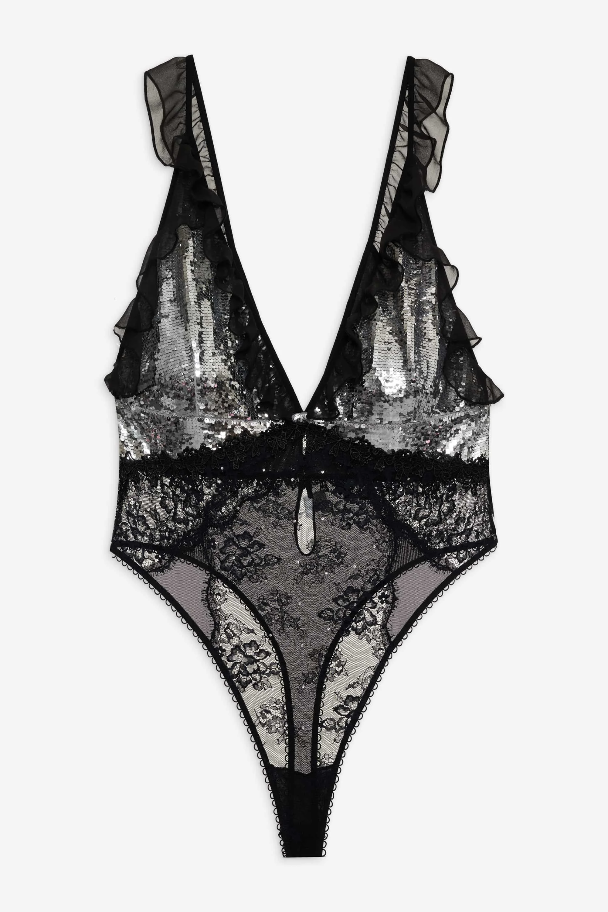 The Maia black thong bodysuit brings to life the magic of winter with its dazzling sequin cups that resemble the sparkles that shimmer across the ice. Featuring a plunging V-neckline with chiffon ruffles, this sexy teddy is finished with intricate lace detailing. Style Notes - Picot trim at leg - Functional tie at the center-back with button and loop closure Fabric + Care - Crafted in 94% polyester, 6% elastane - Lace is made of 93% polyamide, 7% elastane - Ruffles are made of 100% polyester - Lower Back Panel is made of 78% polyester, 22% elastane - Body Lining is made of 78% polyester, 22% elastane - Gusset Lining is made of 100% viscose - Hand wash cold, do not wring or twist - Line dry only