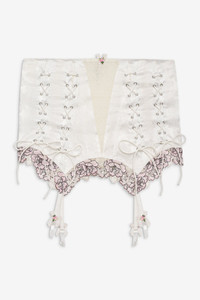 The perfect outfit for festivals—the Marit white garter skirt exudes spring romance with its embroidered scalloped lace edges and lattice details at the princess pleats. Style it with the matching Marit bustier for a festival-ready garter skirt set. Style Notes - Long skirt-length garter - Built-in panty - Garter straps with clips - Double center-back bra clasp closure Fabric + CareBody: 97% Polyester/ 3% Elastane; Contrast 1: 88% Polyamide/ 12% Elastane; Flocking: 100% Polyamide; Contrast 2: 100% Polyester; Gusset: 100% Modal; Exclusive of Decoration Wash Separately Machine Wash Cold Only Non-Chlorine Bleach Tumble Dry Low Remove Promptly From Dryer Do Not Iron Do Not Dry Clean Designed In Los Angeles Assembled In China