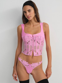 A new top drawer heirloom, the Maye pink bustier is crafted in a floral embroidered mesh with floral jacquard panels. This pink corset features a fully boned bodice, functional hook and eye closure at the center-front, and a classic lace-up detail at back. Pair it with the Maye Thong Panty for a full lingerie set. Style Notes - Cup lining only - Adjustable shoulder straps Fabric + Care - Lower body is crafted in 100% polyester - Upper body is made of 97% polyester, 3% elastane - Mesh is made of 88% polyamide, 12% elastane - Hand wash cold - Only non-chlorine bleach - Do not wring or twist - Line dry - Do not iron - Do not dry clean