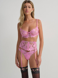 A new top drawer heirloom to cherish, the Maye garter belt is crafted in a floral embroidered mesh and adorned with decorative elastic trim and organza bows. Pair this garter lingerie with the Maye Underwire Bra and Maye Thong Panty for a complete lingerie set. Style Notes - Unlined - Power mesh fabrication - Functional center-front hook and eye closures - Scrunchie straps with functional garter clips Fabric + Care - Crafted in 100% polyester - Mesh is made of 88% polyamide, 12% elastane - Hand wash cold - Only non-chlorine bleach - Do not wring or twist - Line dry - Do not iron - Do not dry clean