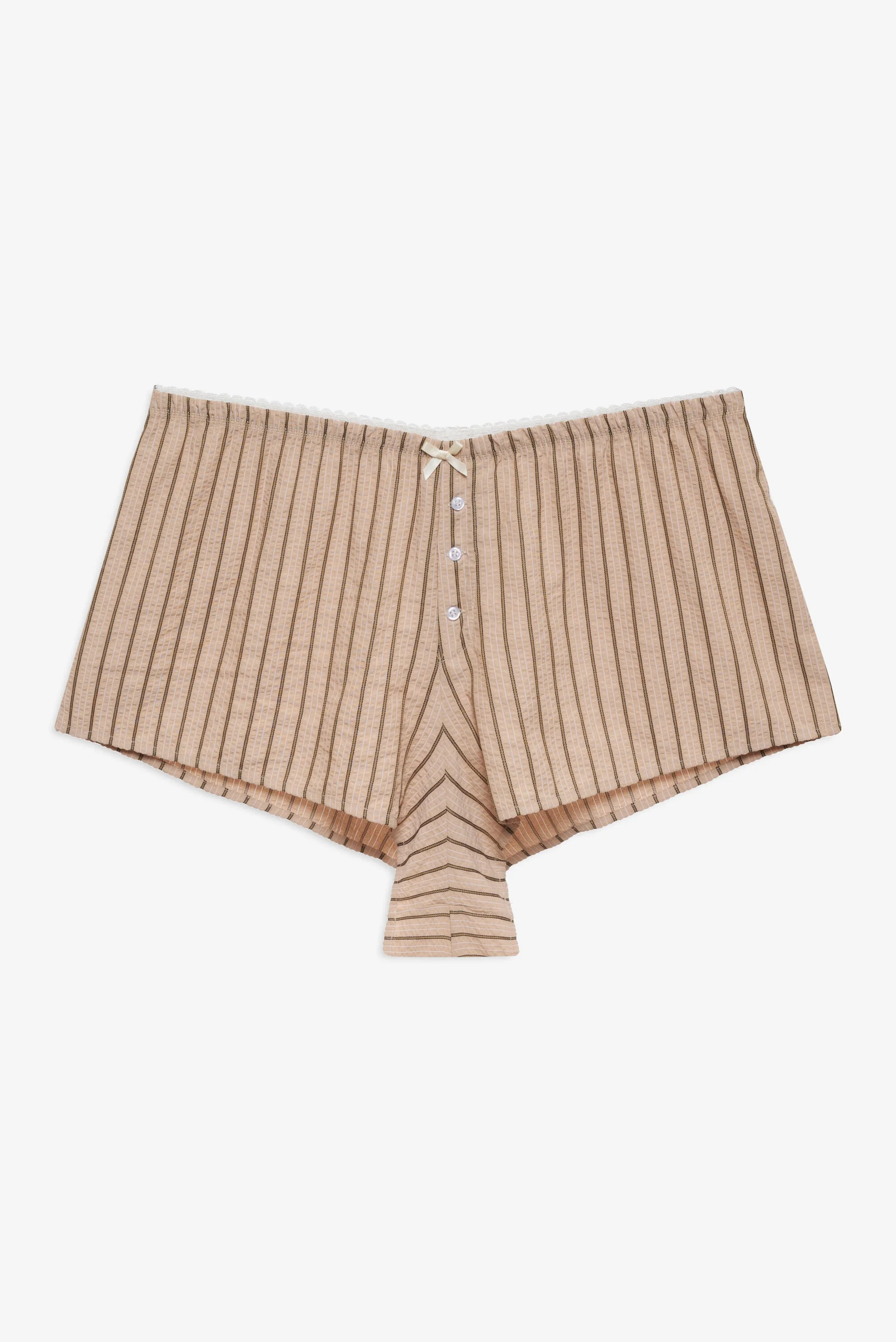 For the cutest stay-at-home uniform, the Mindy striped boxer shorts make for an effortlessly chic look. Crafted in a classic seersucker stripe, these brown boxer shorts spotlight a front boxer placket with buttons and are adorned with picot trims and decorative bow at front waist. Pair with the Mindy Stripped Button-Down Shirt for the complete pajama set. Style Notes - Unlined Fabric + Care - Crafted in 50% polyester, 50% cotton - Machine wash cold - Only non-chlorine bleach - Tumble dry low - Cool iron - Do not dry clean