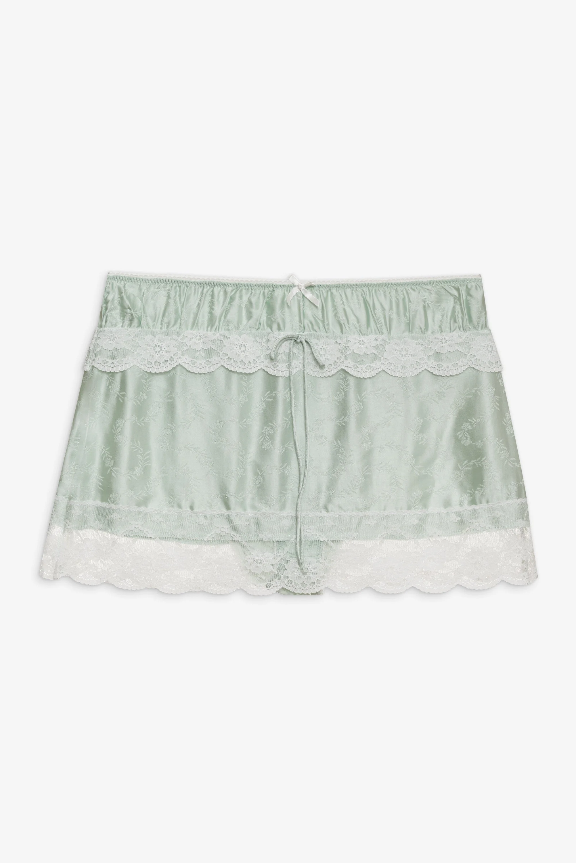 Inspired by vintage lingerie, the Mint Twist micro skirt exudes old-time charm. Crafted in a floral jacquard, this slip skirt features a gathered waist and is adorned with lace trims and a center-front decorative satin ribbon. Style Notes - Built-in panty - Elastic leg opening Fabric + Care - Crafted in 69% rayon, 31% viscose - Lace is made of 100% polyamide - Gusset is made of 100% viscose - Hand wash cold - Only non-chlorine bleach - Do not wring or twist - Line dry - Do not iron - Do not dry clean