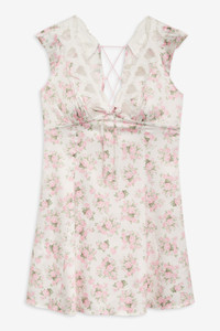 Introducing our nostalgia-infused slip dress from the Naima Collection—an ode to good old-fashioned romance inspired by the sweetest vintage babydoll lingerie. This white and pink slip dress features an all-over rose print, feminine ruffle flutter sleeves, and an embroidered heart window detail at the neckline.