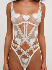 Fall in love with the Pure Heart blue & white mesh teddy–a lingerie bodysuit crafted in a romantic heart embroidered mesh. This thong bodysuit spotlights a sequin heart trim, lace bow appliques, and a completely open back.