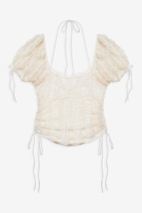 Get into the festival spirit with the Romy sheer blouse–a ruffled crop top with an exposed triangle cup lining and halter tying straps. Designed for slow desert days, this puff sleeve top is adorned with intricate lace trims and decorative bows throughout. Style Notes - Cups are lined - Elasticized neckline and underbust - Functional drawstring ties at side seams Fabric + Care - Crafted in 95% polyester, 5% elastane - Ruffles are made of 100% polyamide - Cup lining is made of 60% polyester, 33% recycled polyester, 7% elastane - Hand Wash Cold - Only Non-Chlorine Bleach - Do Not Wring Or Twist - Line Dry - Do Not Iron - Do Not Dry Clean