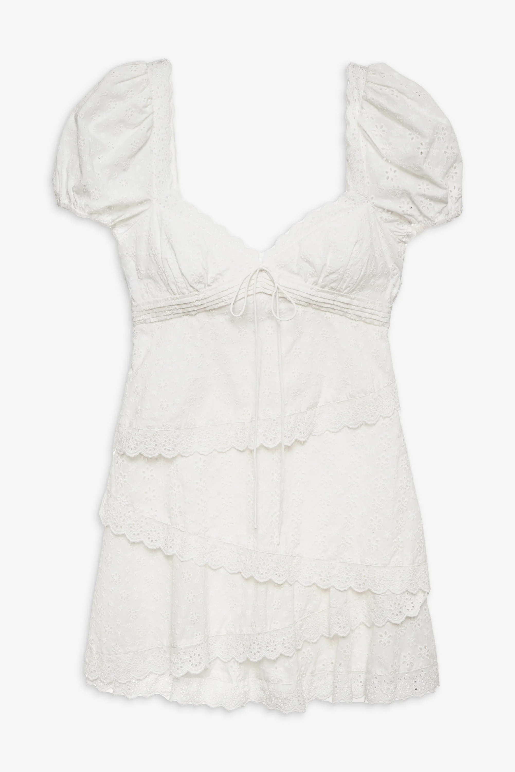 Our bestselling Rosalyn Mini Dress is back in a crisp white eyelet as your new go-to little white dress for spring. Reminiscent of the patchwork dresses of the '70s, this white mini dress features short puff sleeves, nostalgic asymmetrical gathered skirt tiers, and scallop eyelet trim. Style Notes - Fully lined - Pintucks at underbust - Spot ruching at cups - Invisible zipper at center-back Fabric + Care - Crafted in 100% cotton - Lining is made of 100% cotton - Dry clean only