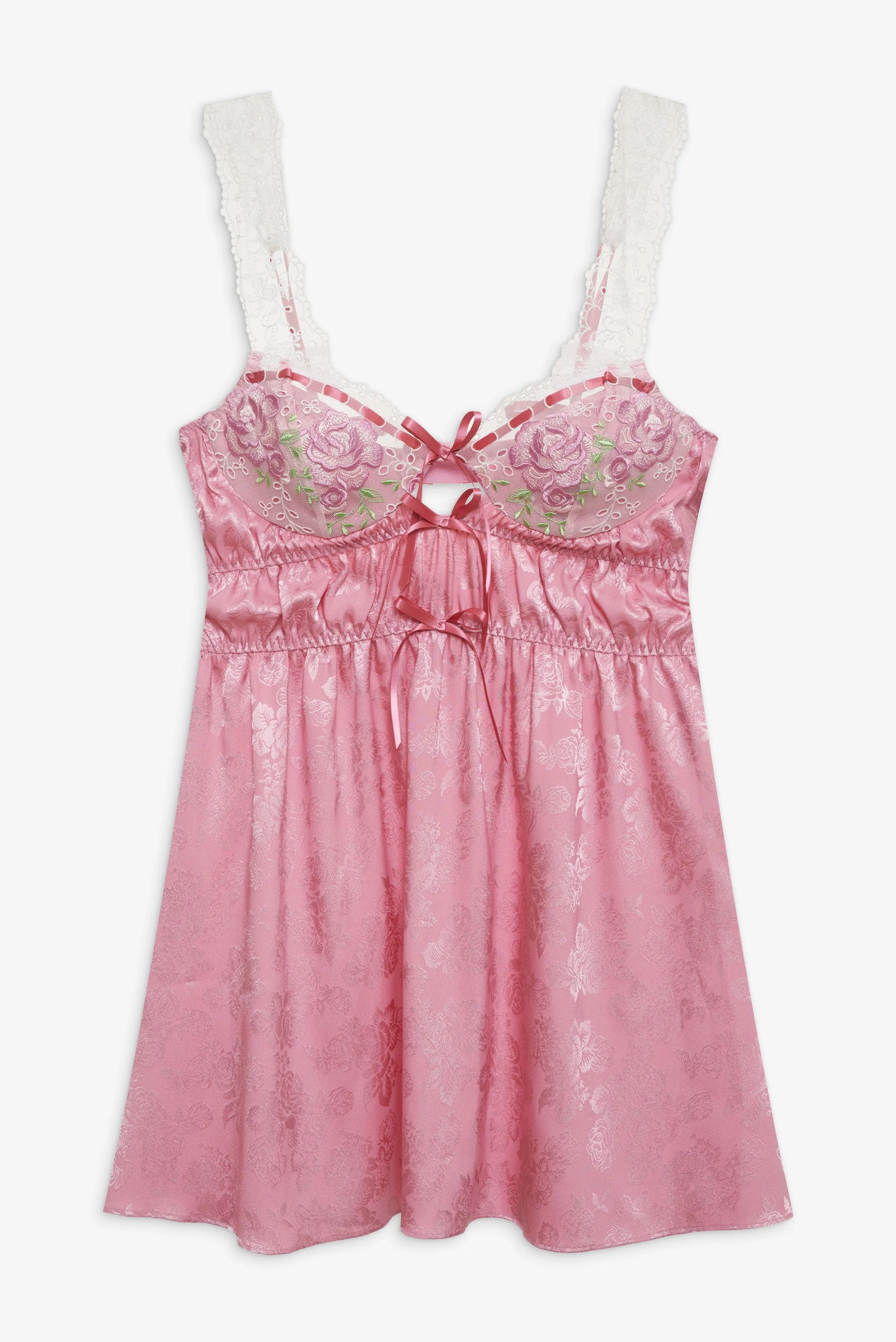 For the barely-there beauty who wants to throw on her summer look and go, the Rose Milk pink slip dress was made for the on-the-go Muse. Crafted in a captivating pink floral jacquard, this underwire mini dress features a gathered bodice and skirt and is adorned with dainty embroidered organza trims, sweet decorative bows, and intricate embroidered eyelet lace slotted with pink ribbon. Style Notes - Cup lining only - Elasticated back waist - Adjustable shoulder straps - Bra hook and eye closure at center-back Fabric + Care - Crafted in 97% polyester, 3% elastane - Lace is made of 100% polyester - Trim base is made of 100% polyamide - Embroidery is made of 100% polyester - Hand wash cold - Only non-chlorine bleach - Do Not Wring or twist - Line dry - Do not iron - Do not dry clean