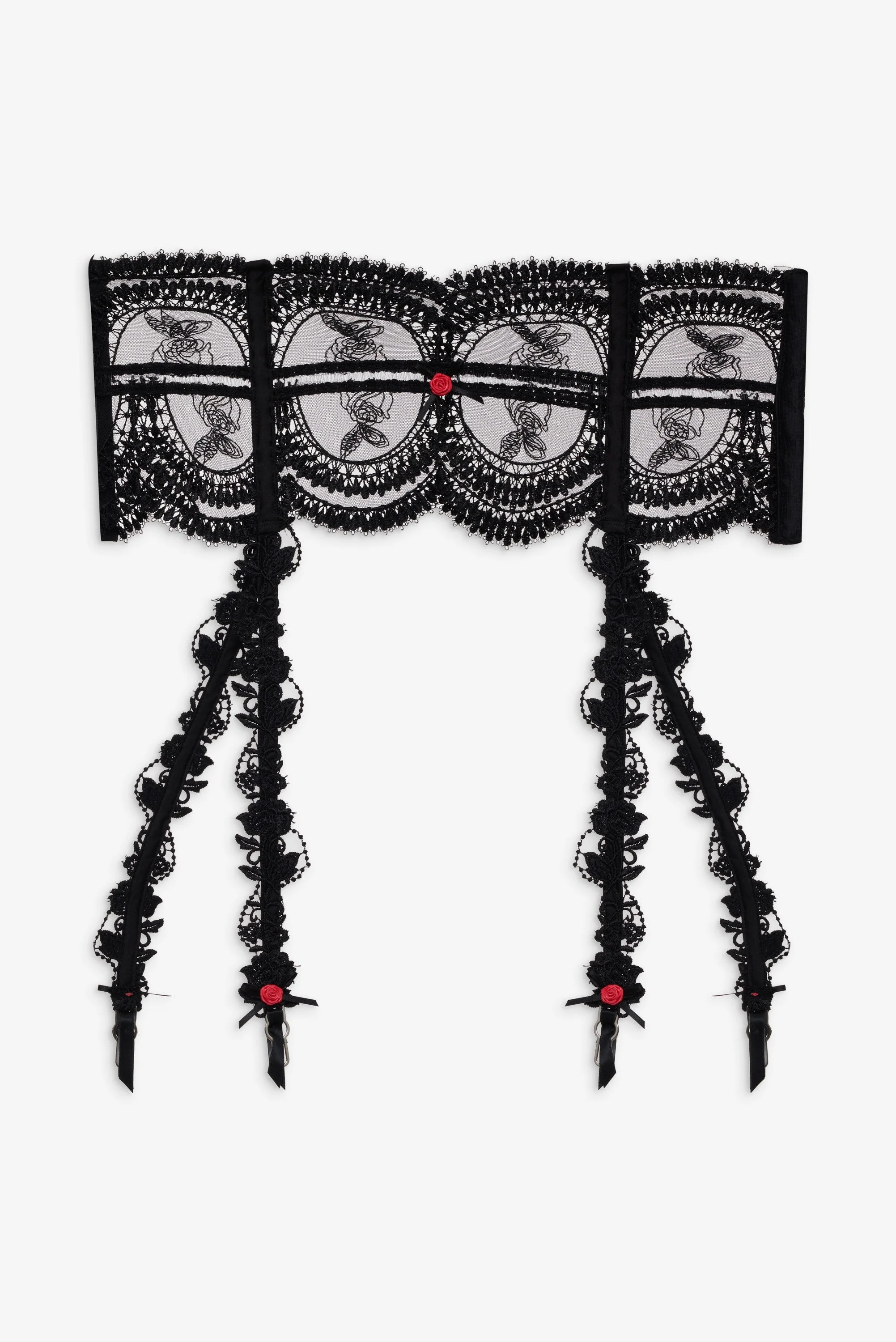 The Roxanne black garter belt is your something naughty for the holidays. Crafted in lace and featuring sexy scalloped edges, this lace garter is adorned with decorative rosettes and skinny bows. Style it with the Roxanne Underwire Bra and Thong Panty for the matching set. Style Notes - Unlined - Boning at the princess pleats and side seams - Hook and eye tape closure at the side seam - Garter straps feature decorative trim with functional garter clips and ribbons Fabric + Care - Crafted in 100% polyamide - Embroidery is made of 100% polyester - Hand wash cold, do not wring or twist - Line dry only