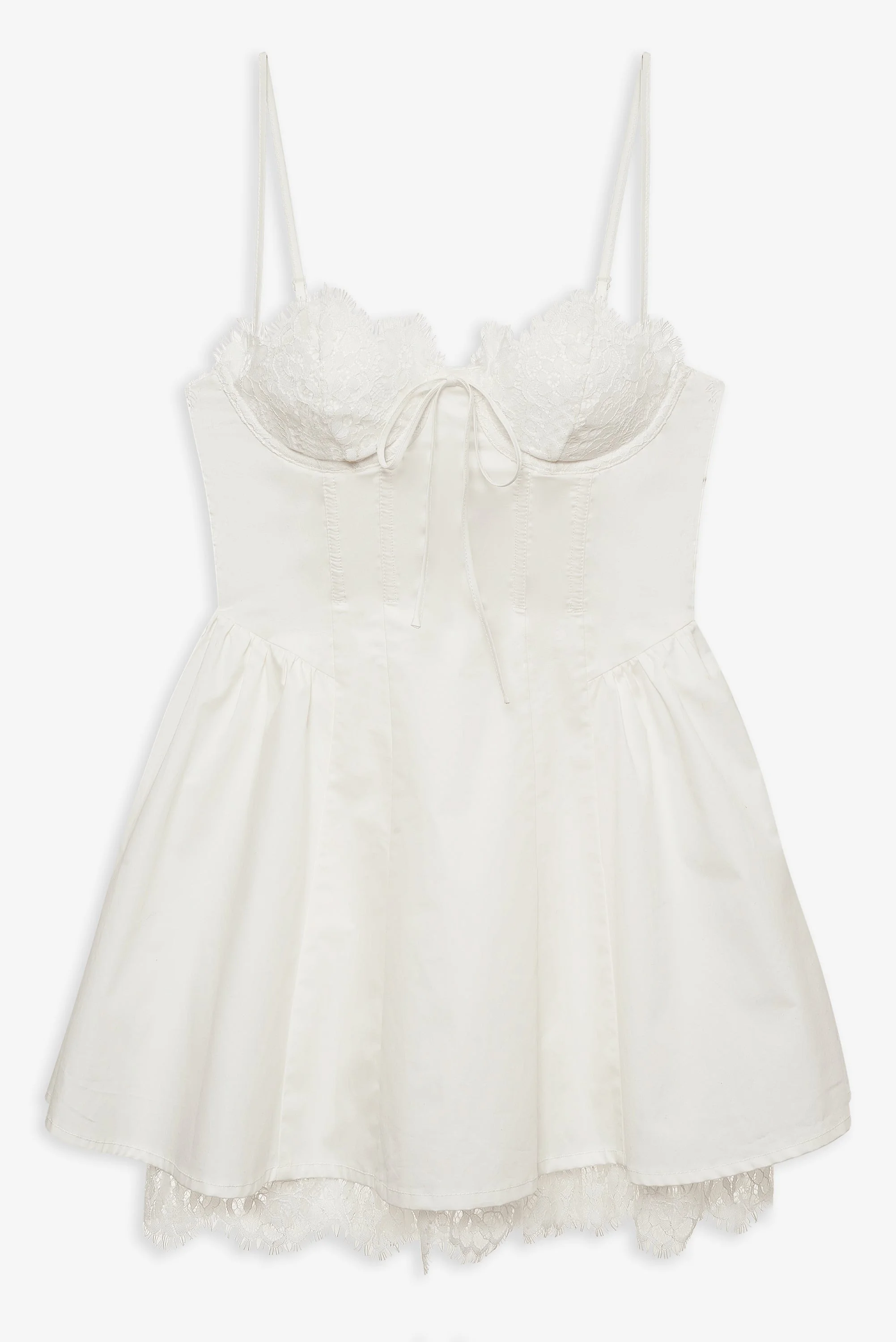 The perfect little white dress for the spring season and beyond, the Shae mini dress charms with its crisp poplin fabrication and lace detailing. This white mini dress features underwire cups, a fitted bodice with boning throughout, and flared skirt. Style Notes - Fully lined - Lined underwire cups - Adjustable shoulder straps - Invisible zipper at the center-back Fabric + Care - Crafted in 97% rayon, 3% spandex - Contrast is made of 100% nylon - Lining is made of 100% cotton - Dry clean only