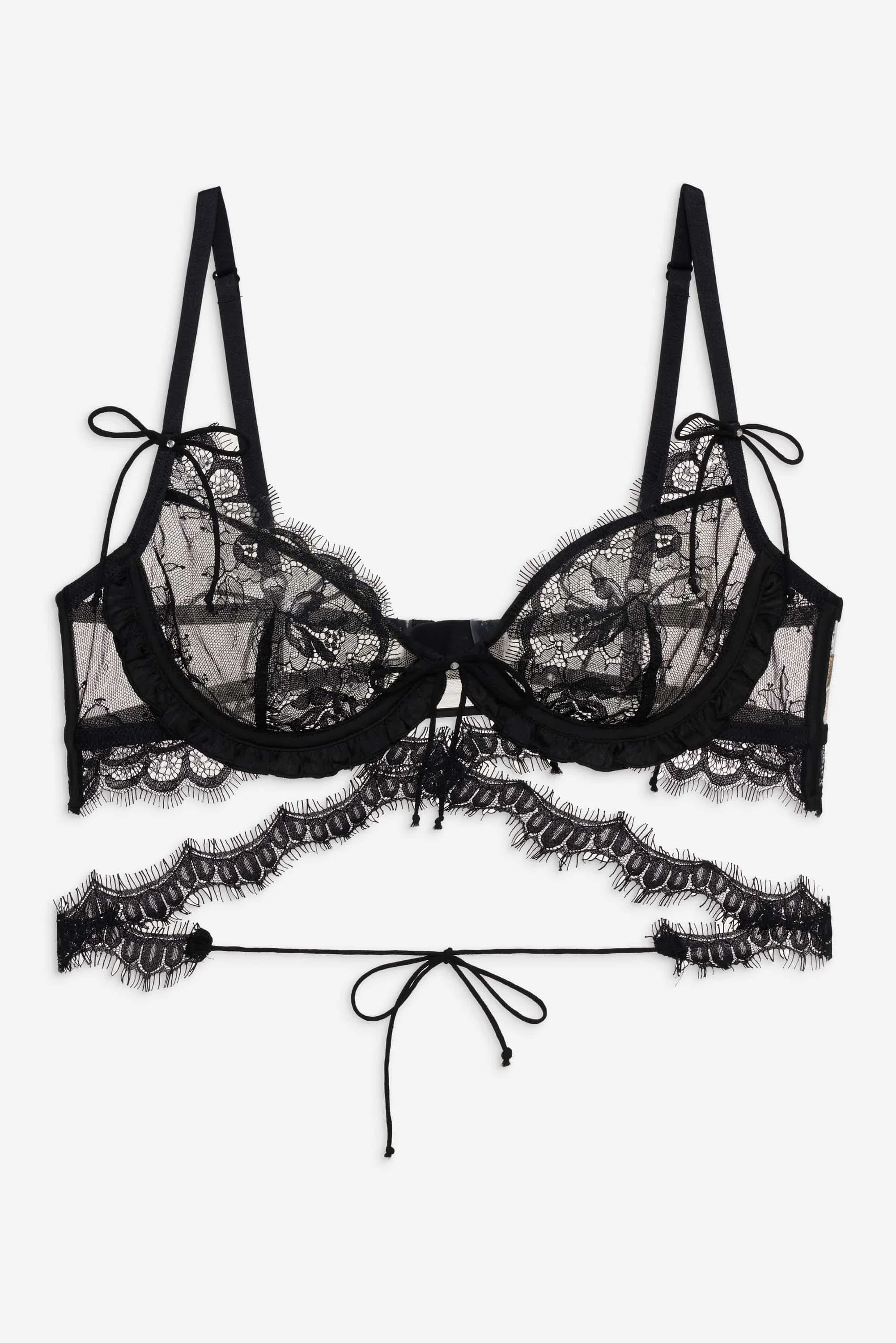 Designed for the sultry Muse, the Sonja black underwire bra is both elegant and seductive. Crafted in elegant lace, this lace unlined bra spotlights scattered rhinestones, fixed skinny bows, and a scalloped lace trim.Pair it with the Sonja Thong Panty and Garter Belt for the complete lingerie set. Style Notes - Unlined - Adjustable shoulder straps - Cage back - 3-row hook and eye closure Fabric + Care - Crafted in 100% polyamide - Hand wash cold, do not wring or twist - Line dry only