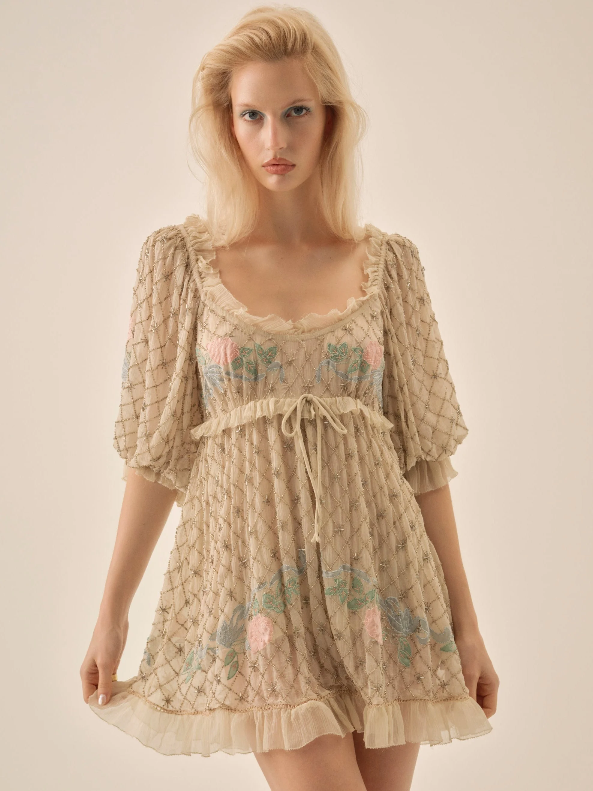 FOR LOVE & LEMONS KEEPSAKES: We named this exquisite babydoll dress the Spellbound Rose Mini Dress for a reason. Featuring an empire ruched bodice with ruffled neckline, this mini dress is adorned with intricate hand-beading. Style Notes - Fully lined - Elasticized three-quarter length puff sleeves Fabric + Care - Crafted in 100% viscose - Lining is made of 100% viscose - Trim fabric is made of 100% polyester - Lace is made of 100% cotton - Dry clean only