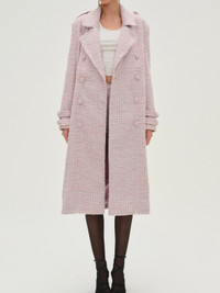 Designed for the feminine Muse, the Strawberry Cream pink coat is crafted in tweed with shimmering silver lurex threads woven throughout. This tweed coat spotlights a notched collar and lapel, plus covered buttons at the shoulders and sleeves, plus non-functional buttons at the front. Fit Notes - The Strawberry Cream Tweed Coat is designed for a relaxed fit. - We recommend taking your usual size. Style Notes - Heavy-weight satin lining Fabric + Care - Crafted in 99% polyester, 1% metallic - Lining is made of 100% polyester - Dry clean only
