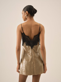 Glisten through the night with the Sylvie sequin mini dress—a brown mini dress adorned with a contrast lace neckline and a decorative rosette with tie at the neckline. Style Notes - A-line silhouette - Fully lined in chiffon - Adjustable skinny shoulder straps Fabric + Care - Crafted in 100% polyester + 100% pet - Lining 1 is made of 100% nylon - Lining 2 is made of 100% polyester - Contrast 1 is made of 100% nylon - Contrast 2 is made of 100% polyester - Dry clean only