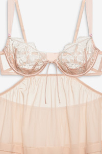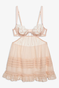 Elevate everyday summer rituals with the Tea Cake underwire slip dress. Crafted in a pastel peach chiffon, this sheer babydoll is adorned with lace embroidered cups, gathered pin tucks, and a ruffled hem. Style Notes - Unlined - Elastic waist - Adjustable shoulder straps - Hook and eye closure at center-back Fabric + Care - Crafted in 100% polyester - Lace is made of 100% polyamide - Embroidery is made of 100% polyester - Lining is made of 100% polyester - Hand wash cold - Only non-chlorine bleach - Do not wring or twist - Line dry - Do not iron - Do not dry clean
