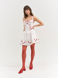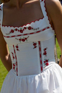 Ultra-feminine and inspired by vintage charm, the Tea Time corset mini dress is crafted in 100% cotton poplin. Adorned with fall-inspired floral embroidery and scalloped hems throughout, this white mini dress features a squared neckline, boned bodice, and gathered skirt. Fit Notes - True to size Style Notes - Fully lined - Invisible zipper - Functional back tie - Pockets at side seams Fabric + Care - Crafted in 100% cotton - Lining is made of 100% cotton - Dry clean only